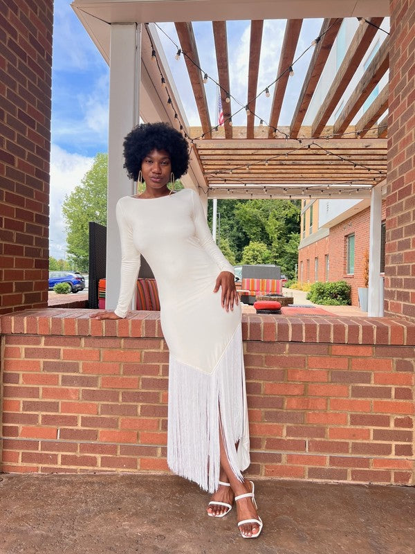 Elevate your style with the captivating Zanobia Dress. Featuring double-layered smooth fabric and sleek fringe embellishments, this dress is designed to make a statement. The addition of an open back enhances its allure, ensuring you own the room and captivate the crowd. Don't miss out on this showstopping piece - get yours today and shine like never before!